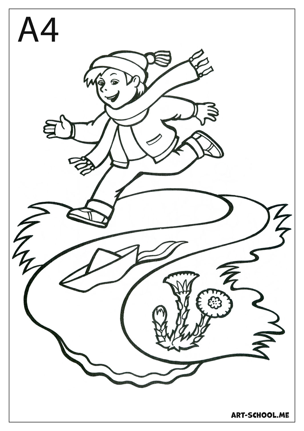 Chłopiec biegnący wzdłuż strumienia. Chłopiec i statek. Wiosenne zabawy.
