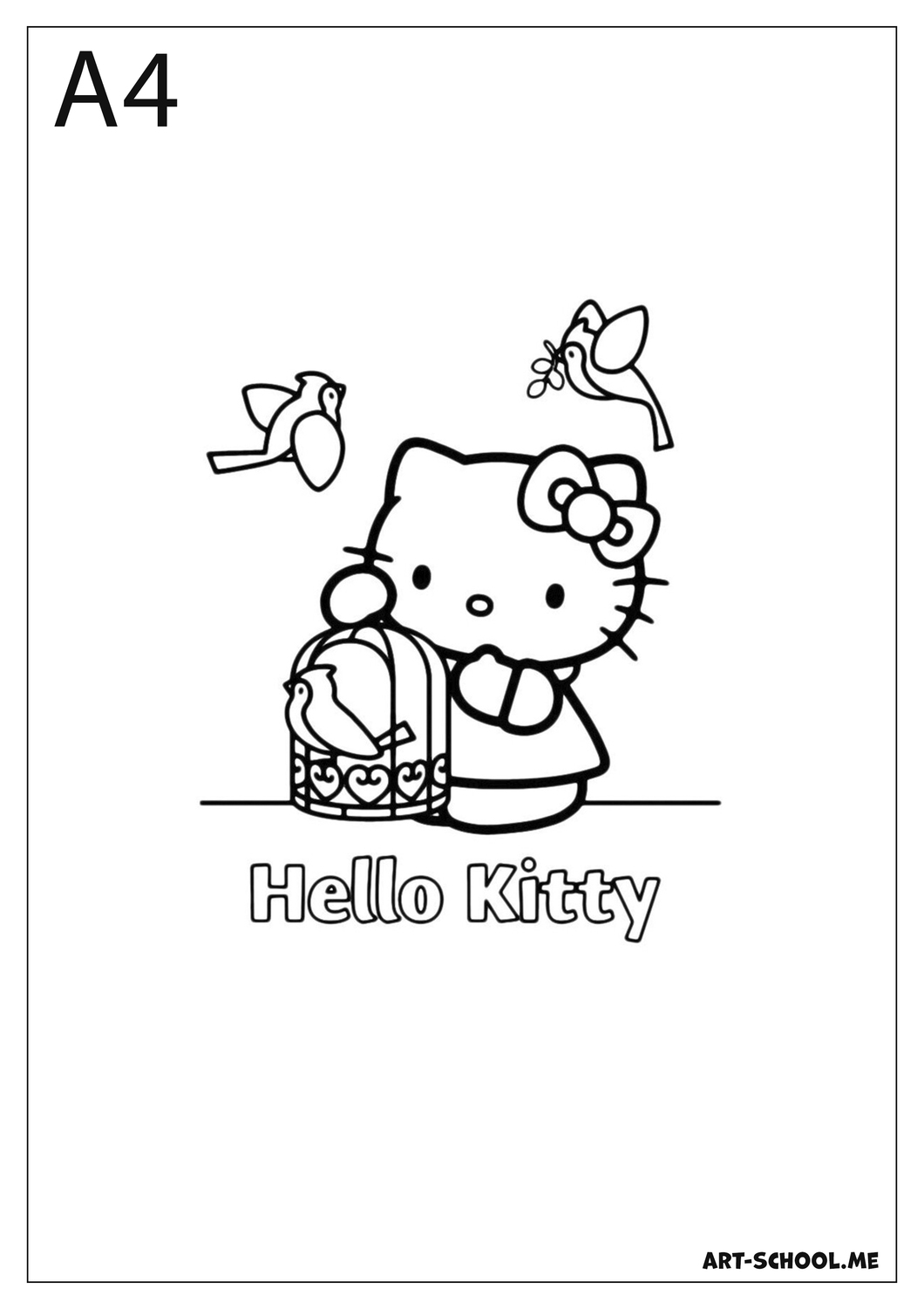 Kotka Hello Kitty z ptakami! Kotka z klatką dla ptaków! Hello Kitty! Darmowa kolorowanka do wydruku!